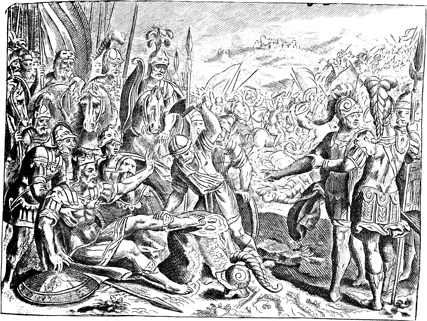 Description: Joshua and the Hebrew army defeat the combined Canaanite-Perizzite army (back); in the foreground, King Adoni-Bezek has his big toes cut off.