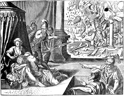 Description: Delilah cuts Samson’s hair, as he sleeps, and in the background Samson destroys the Philistine temple.
