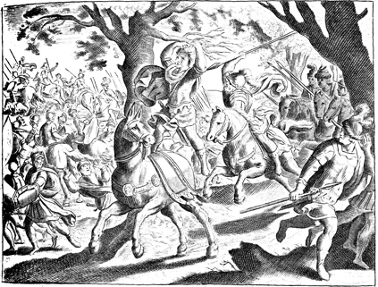 Description: While Absalom is defenseless, hanging by his hair (or head) from a tree, Joab seizes the opportunity to slay him.