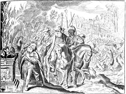 Description: God consumes Elijah's sacrifice with fire at Mt. Carmel, as King Ahab and the prophets of Baal look on.