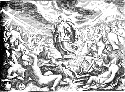 Description: Ezekiel's vision of the valley of dry bones. As God looks on from above, Ezekiel commands the dry bones to come to life. God’s presence is indicated by the placement of the Tetragrammaton in an illuminated cloud.