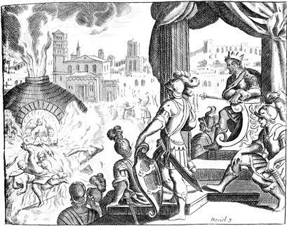 Description: Nebuchadnezzar has Shadrach, Meshach, and Abednego thrown into the fiery furnace for not bowing to the idol, but an angel appears to protect them.