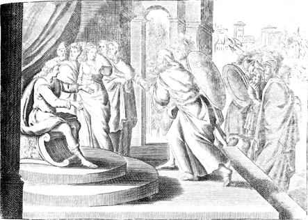 Description: Daniel discerns the elders false witness in the trial of Susanna; in the background, the two elders are stoned.