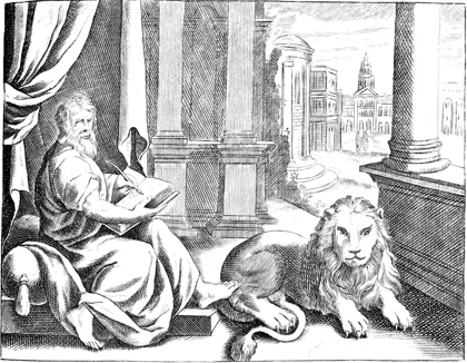 Description: St. Mark writes his gospel with his attribute, the lion, nearby.