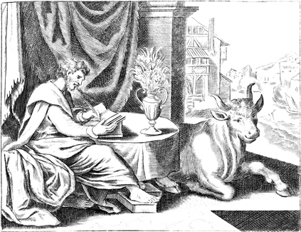 Description: St. Luke writes his gospel with his attribute, the bull, nearby.