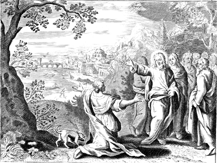 Description: The Canaanite woman asks Jesus to cast a demon from her daughter; a dog appears at her feet representing the content of their discussion.