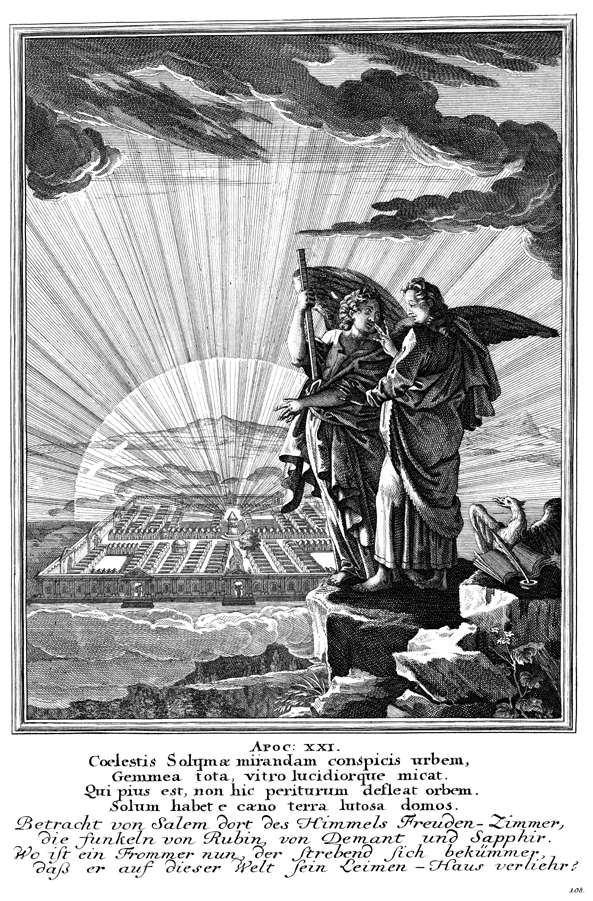 Description: An angel shows John the new heavenly Jerusalem. John's attribute, the eagle is nearby.