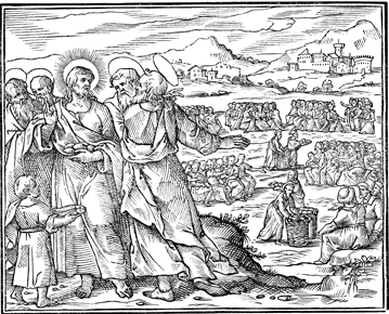 Description: Jesus feeds the 5000 with two fish and five loaves of bread.