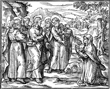 Description: Jesus converses with the Canaanite woman; a dog is nearby symbolizing the content of their discussion.