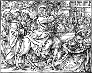 Description: Jesus rides into Jerusalem on a donkey to the waving of palm branches.