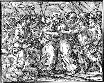 Description: Jesus is arrested by soldiers after Judas identifies him with a kiss. During the melee Peter draws his sword and strikes Malchus, the servant of the high priest, severing his ear.