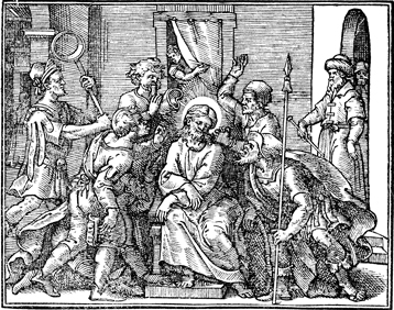Description: Jesus is mocked by the Roman soldiers.