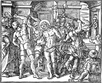 Description: Jesus is scourged by the Roman soldiers.