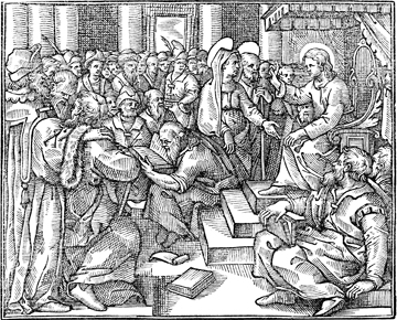 Description: Mary and Joseph find the twelve-year-old Jesus in the temple, sitting among the teachers, listening and asking questions.