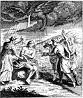 Description: Job's wife and friends appeal to him in the midst of his affliction; the devil appears overhead as the source of Job's affliction.