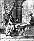 Description: Solomon is depicted as the author of the Son of Songs as two lovers converse with a deer by their side in the garden.