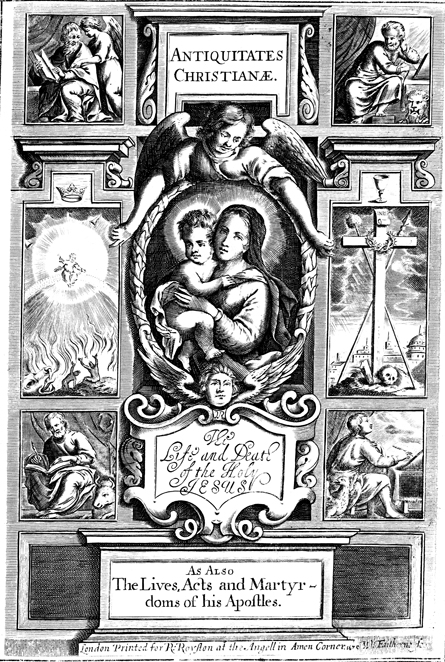 Description: This historiated title-page border depicts the Madonna and child surrounded by images of the four gospel writers with their respective attributes, the instruments of crucifixion, and an image of the second coming.