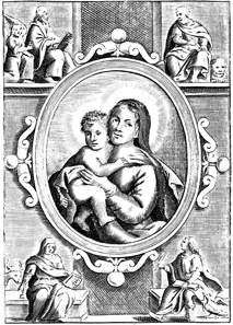 Description: The Madonna and child surrounded by images of the four gospel writers with their attributes.