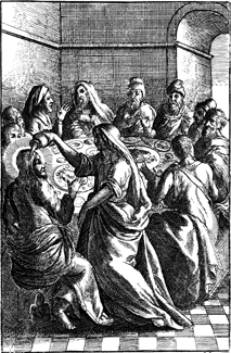 Description: A woman anoints Jesus' feet with perfume while he eats at the home of Simon the Leper in Bethany.