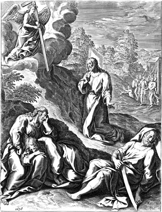 Description: As the disciples sleep, Jesus prays that His cup may pass. His captors arrive in the background.