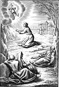 Description: Jesus prays in the Garden of Gethsemane as angels minister to him and the disciples sleep. In the background, soldiers arrive to arrest Jesus.