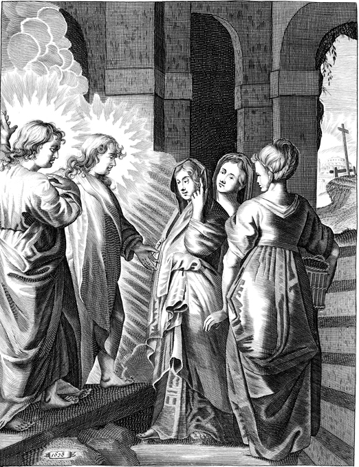Description: Two angels inform Mary the mother of Jesus, Mary Magdalene, and the other Mary that Jesus has risen from the dead.