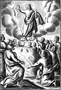 Description: Jesus Christ ascends into heaven as his disciples look on.