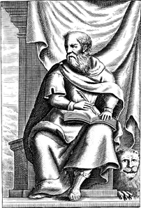 Description: Saint Mark writes his gospel as his attribute, the lion, is nearby.