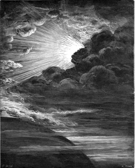 Description: The light is separated from the darkness. The artist, Gustave Doré (1832-1883), has placed his signature at the lower left of the woodcut, and the engraver’s signature, Héliodore Pisan (1822-1890), is located at the lower right.