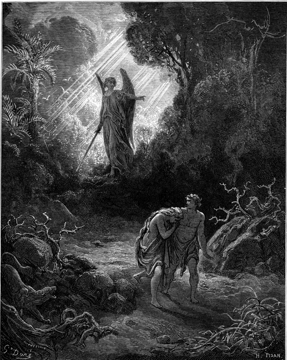 Description: Adam and Eve are driven from the Garden of Eden by an angel with a sword. The artist, Gustave Doré (1832-1883), has placed his signature at the lower left of the woodcut, and the engraver’s signature, Héliodore Pisan (1822-1890), is located at the lower right.