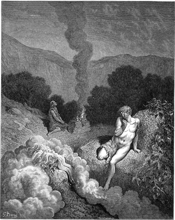 Description: Cain and Abel offer sacrifices to God; Abel's is accepted and Cain's is rejected. The artist, Gustave Doré (1832-1883), has placed his signature at the lower left of the woodcut, and the engraver’s signature, Adolphe François Pannemaker (1822-1900), is located at the lower right.
