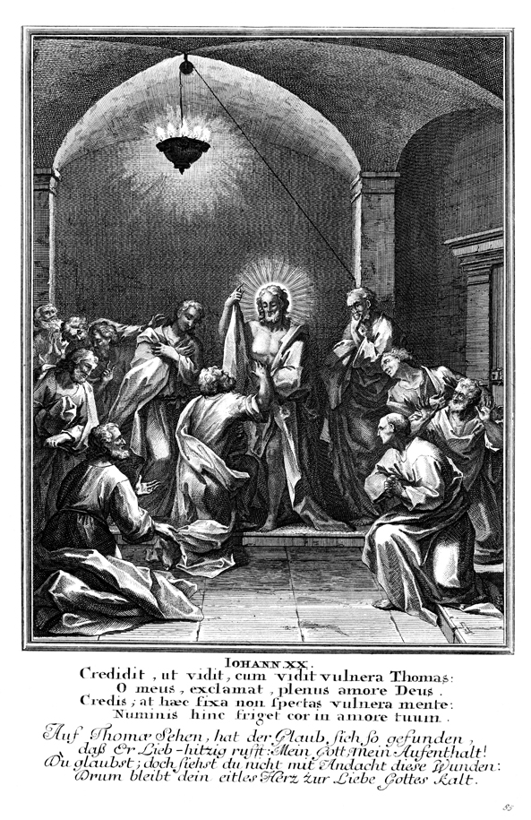 Description: Jesus appears to his disciples following the resurrection and instructs Thomas to touch his wounds.