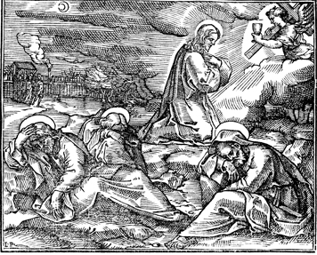 Description: As the inner circle sleeps, Jesus prays that his cup may pass; in the background, the soldiers arrive to arrest Jesus.