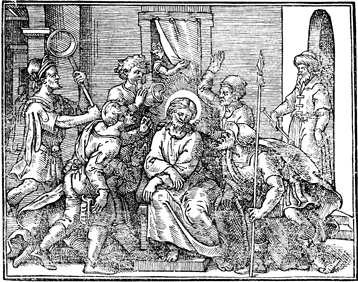 Description: Jesus is mocked while tried before the Sanhedrin.