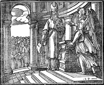 Description: The angel Gabriel visits Zechariah in the temple to tell him that he will have a son named John.