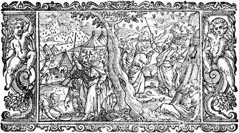 Description: Manna and quail fall from heaven upon the Hebrew camp.