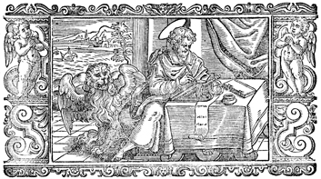 Description: Mark writes his gospel as his attribute, the lion, is nearby.