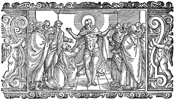 Description: Jesus appears to the disciples following his resurrection. While Thomas appears kneeling before Jesus and touching Jesus’s side, this reflects Jesus’ exchange with Thomas in John 20:24-27, rather than the text of Luke.