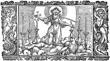 Description: John's vision of the one like a son of man among the seven golden lampstands. John is pictured at his feet.