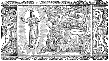 Description: The woman’s baby is saved from the beast upon his birth, and the dragon is defeated by angels (front). All the people of earth, whose names are not in the book of life, worship the seven-headed beast emerging from the sea, as another beast emerges from the earth (back right).