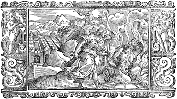 Description: An angel, holding a key, binds the beast in the abyss for the thousand years of peace (right), as an angel reveals to John the new heavenly Jerusalem (left).