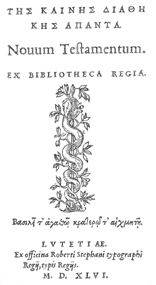 Description: Title Page of the New Testament in Greek and Latin illustrated with a snake and a vine.