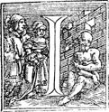 Description: An initial letter I with a man sitting destitute by a wall.