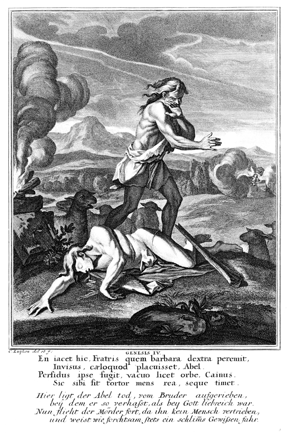 Description: Cain stands over Abel after murdering him in a fit of jealousy because God preferred his brother’s offering to his own. The artist’s signature, Caspar Luyken (1672-1708), appears at the bottom left.