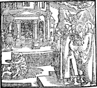 Description: Lazarus sits at the gate of the rich man, who lives in luxury. In the rear, the rich man begs Abraham to allow Lazarus to put water on his tongue to quench his torment.