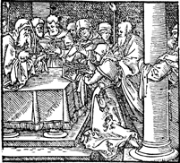 Description: Mary and Joseph bring the infant Jesus to present him at the temple .