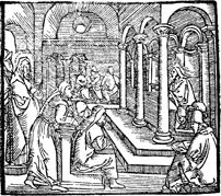 Description: Mary and Joseph find the twelve-year-old Jesus in the temple, sitting among the teachers, listening and asking questions.