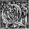 Description: An initial letter Q with the Greek philosopher Diogenes and the Greek philosopher and pupil of Socrates, Aristippus.