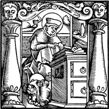 Description: A stylized rendering of the Evangelist Mark composing his gospel with a lion at his feet. The lion is the symbol for Mark's gospel, drawing on Ezekiel 1:10, which refers to four creatures, each of which was associated by Irenaeus (d. 220) with one of the four New Testament gospels. This woodcut is also used in the 1536 "Zurich Bible" and is based on the design of Hans Holbein.