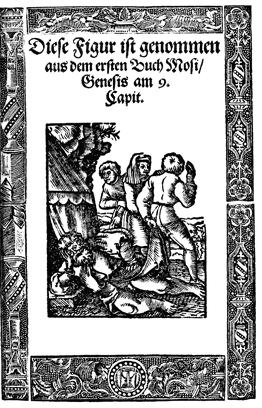 Description: Ham dishonors Noah by pointing out his nakedness, but Shem and Japheth cover their father with a sheet.